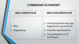 Mga Mahalagang Konsepto ng Ekonomiks Efficiency Masinop na pamamaraan ng paggamit sa limitadong pinagkukunang-yaman upang matugunan ang mga pangangailangan at kagustuhan ng tao. Ito ay dahil ang kahit anong sistemang pang-ekonomiya ay maaaring pakialaman ng isang sentral na awtoridad. Ang command economic system ay karaniwang nakikita sa mga komunistikong lipunan dahil ang karamihan ng mahahalagang desisyon pang-ekonomiya ay nakabatay sa desisyon ng pamahalaan.
