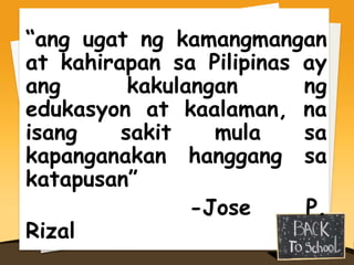 Dahil dito kailangang matutukan umano ng susunod na gobyerno lalo na ang mamumuno sa Department of Education DepEd ang pagdagdag sa silid-aralan at mga guro Bernard Taguinod 2010 Lumabas kamakailan ang isang United Nations report na nagsasabingang kalidad ng edukasyon sa Pilipinas ay mas mababa pa kesa sa kalidad ng edukasyon ng Tanzania at. Ang mga programang pantulong sa ilalim ng Batas na ito ay ipagkakaloob lámang sa mga mag-aaral na mamamayan ng Pilipinas. Ang Pilipinas ay kaisa sa mga bansang nagtataguyod ng Edukasyon para sa Lahat Education for All na naglalayong mapabuti ang kalidad ng edukasyon ng bawat Pilipino bata man o matanda.