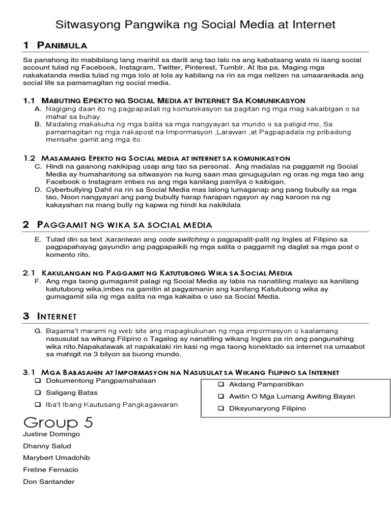 Dinamiko o pabago-bago Gamit ang inyong account sa ibat ibang social media sites at maaari ring sa blog post. SITWASYONG PANGWIKA SA SOCIAL MEDIA O INTERNET Sa paglipas ng panahon maraming pagbabago na ang nagaganap sa ating mundo mula sa bahay na pawid nagkaroon na ng mga bahay na bato at nang lumaon nagkaroon na ng mga gusali. View Q21-Sitwasyong Pangwikapdf from HUMSS 101 at Republic Central Colleges Angeles City.
