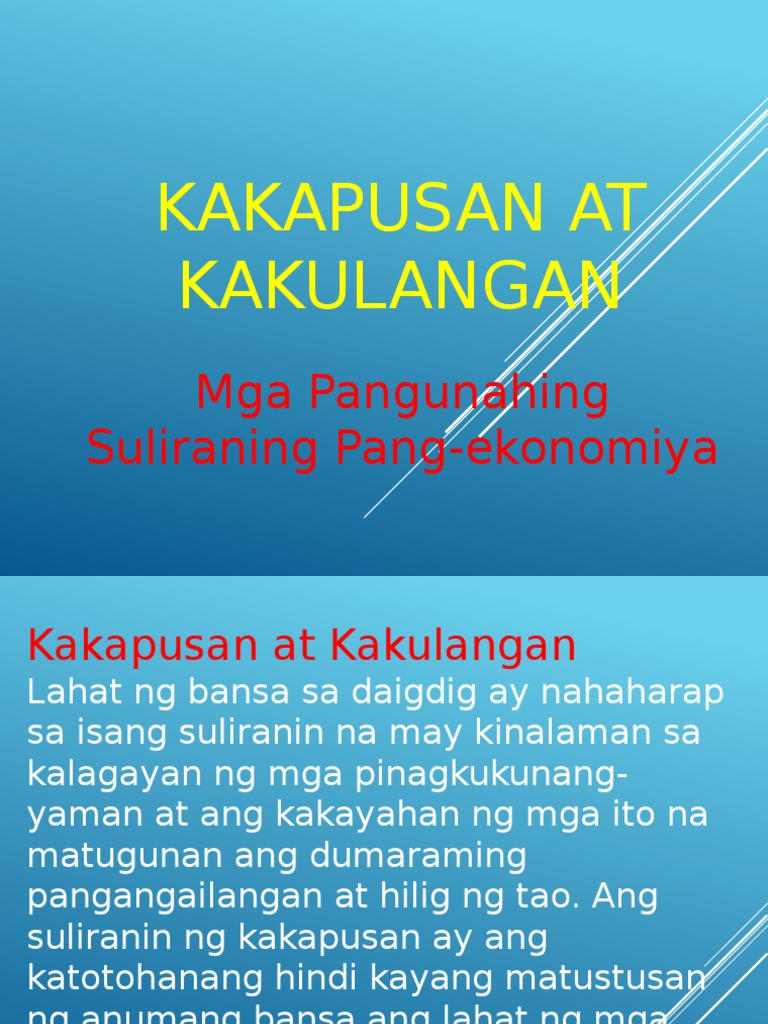Ang kakapusan ay pangunahing dahilan ng pagkakaroon ng mga suliraning pang-ekonomiya dahil sa pagnanais na matugunan ang walang katapusang pangangailangan at hilig ng tao kailangang isipin ang mga paraan upang magamit nang lubusan ang mga pinagkukunang-yaman. Kahalagahan ng HDI Bigyang-diin na ang mga tao at ang kanilang kakayahan ang dapat na pinakapangunahing pamantayan sa pagsukat ng pag-unlad ng isang bansa hindi lang ang pagsulong ng ekonomiya nito. Mga suliraning kinakaharap ng bansa.