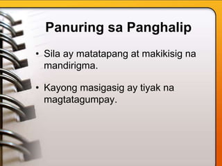 Pahambing - Ang pang-uring ginagamit sa pagtutulad ng dalawang pangngalan o panghalip. Si Fidela ang _____ na mang-aawit sa naging panauhin sa aming paaralan. Isaalang-alang sa pagsulat ng sanaysay ang sumusunod na pamantayan.