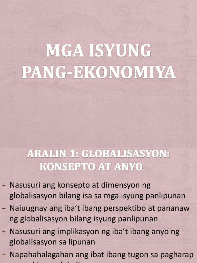 Isyung pang ekonomiya globalisasyon. Isang ingat-yaman ng mga tradisyong nakagalak dito. View GLOBALISASYON SEMINARpptx from MANA INTERNATIO at Our Lady of the Pillar College-Cauayan. Hangarin sa pag-aaral ng mga aralin na nakapaloob sa modyul na ito na maunawaan ng mga mag-aaral ang mga hamon at tugon sa isyung nabanggit tungo sa pagpapabuti ng kalidad ng pamumuhay.
